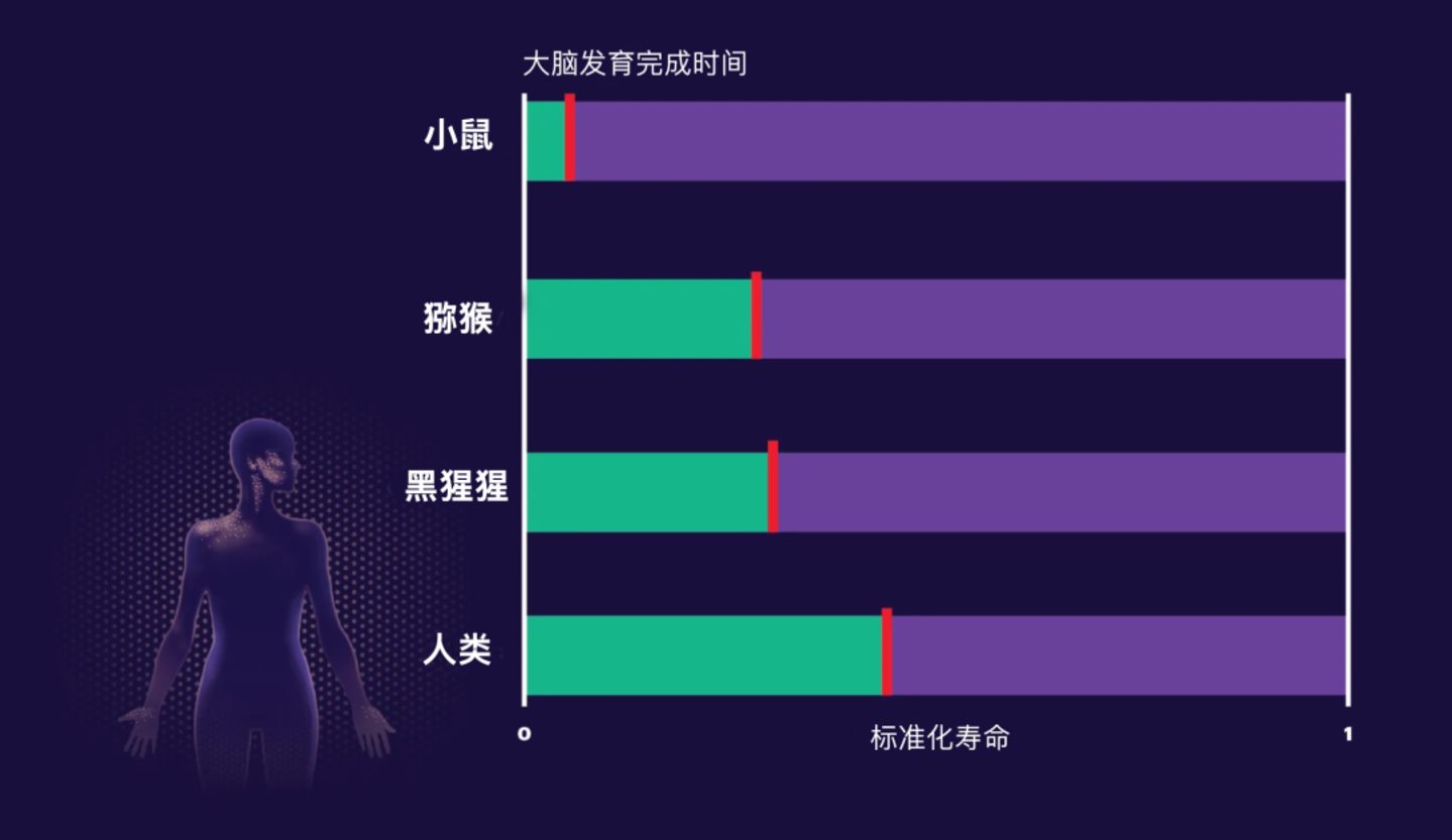 大脑发育速度因物种而异,而人类大脑的发育尤为漫长:例如,小鼠大脑仅用其寿命的5%就完成发育;猕猴和黑猩猩约用需要三分之一的寿命;而人类大脑从发育、成熟到神经连接的优化完成需要约30年——几乎是平均寿命的一半。