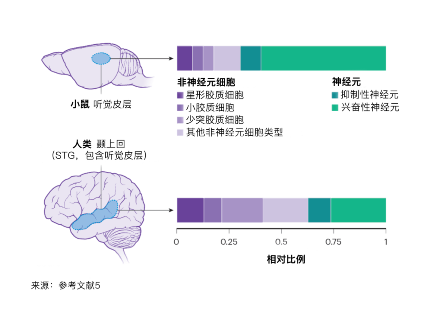 以人类和小鼠大脑皮层中处理听觉信息的这两个具有可比性的区域为例。相对于抑制神经活动的抑制性神经元,小鼠的这个区域中传播信号的兴奋性神经元的比例更高。而人类的相应区域中,非神经元细胞(如星形胶质细胞、少突胶质细胞和小胶质细胞)的比例要高得多。这些细胞为神经元提供支持,并且在发育过程中帮助修剪和完善神经元之间的连接,其与神经元的比例是小鼠的五倍。