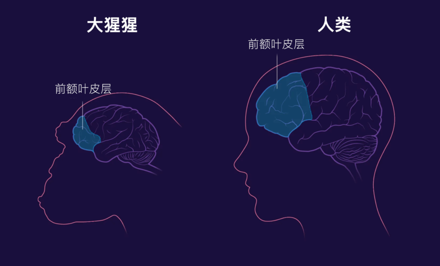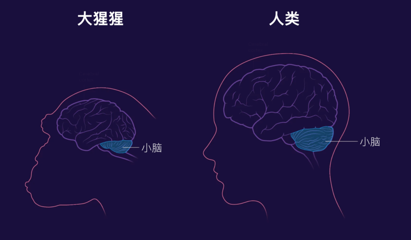 尽管人类大脑在进化过程中变大了,但这种变化并不是均匀的,有些脑区的扩张比其他区域更加显著。其中,扩张尤为突出的是大脑皮层,这一区域负责计划、推理、语言以及人类擅长的许多其他行为。其他区域,比如小脑也有所扩张,它位于大脑后部,具有神经元密集的特点,有助于进行运动和规划。另外,黑猩猩和人类的前额叶皮层结构相似,不过在人类大脑中,前额叶皮层占据的空间比在黑猩猩大脑中要大得多。