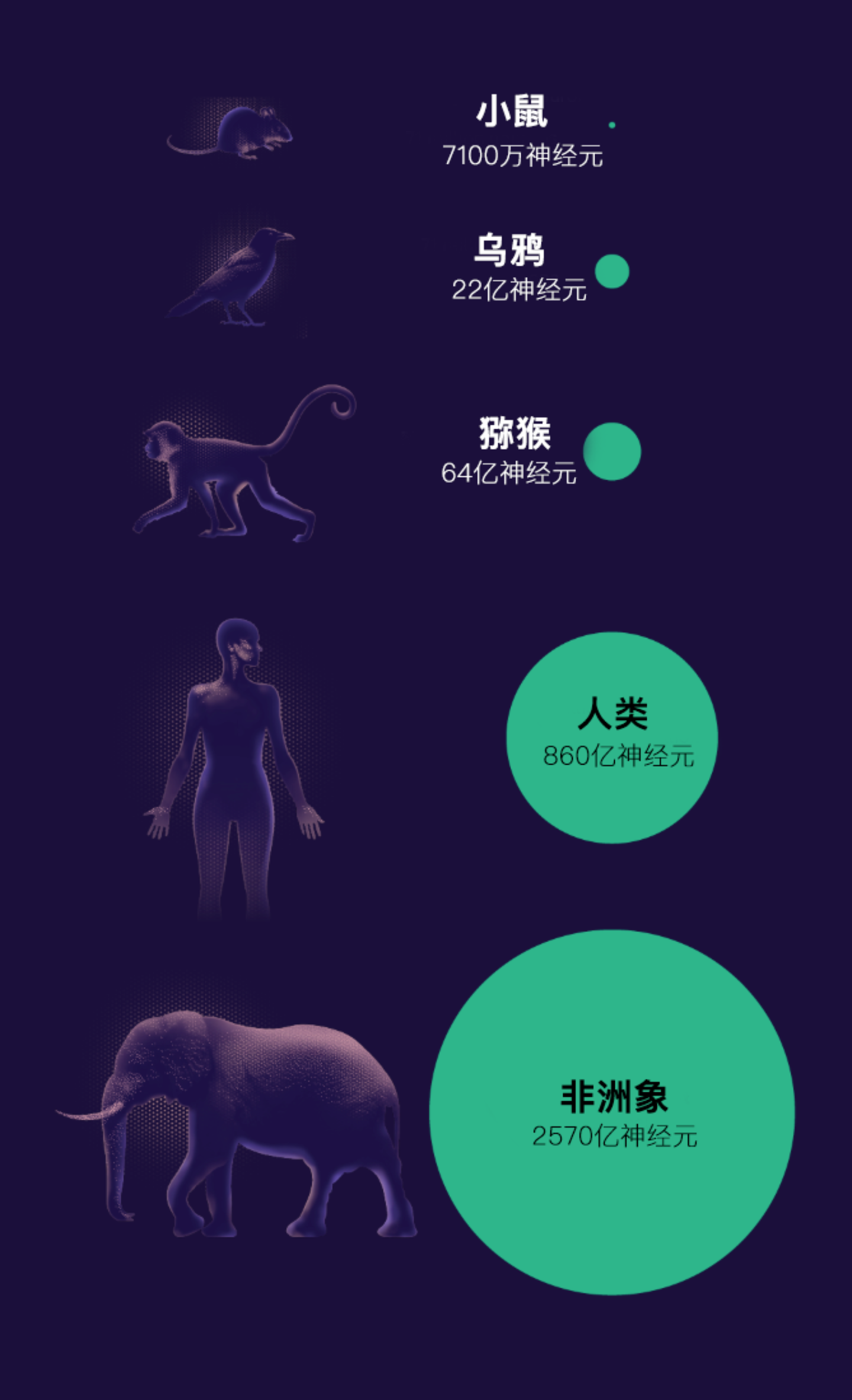 与其他动物相比,人类大脑中的神经元数量也有很大差异。例如,人类大脑的神经元数量大约是老鼠大脑的 1000 倍,是猕猴大脑的13.5倍[2]。然而,大脑尺寸和神经元数量并不能决定一切;一些在大脑的外观和发育上与哺乳动物不同的生物,比如渡鸦和鸦科的其他成员,它们的学习和记忆能力也令人惊叹。华盛顿特区乔治・华盛顿大学的人类学家兼神经科学家切特・舍伍德(Chet Sherwood)认为:“仅靠大脑尺寸无法解释人类的认知能力。”