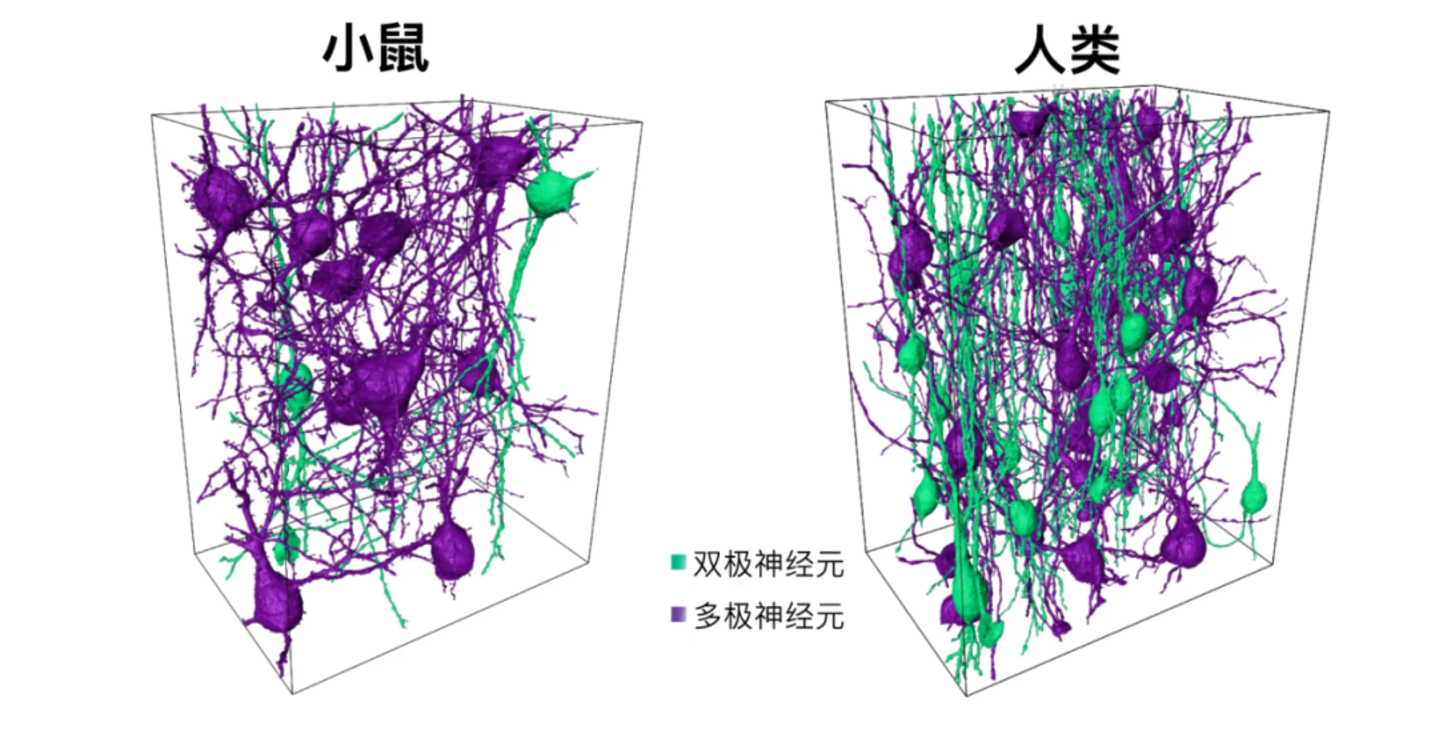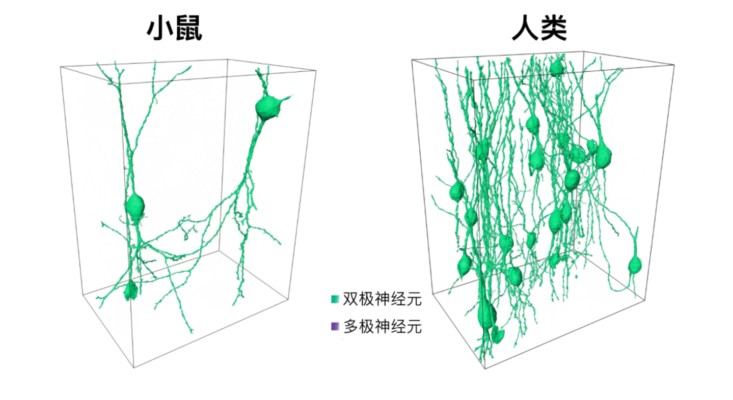 一类被称为双极神经元的中间神经元倾向于与同类细胞相互连接(在图中以绿色显示),这类神经元在小鼠体内较为少见,但在人类体内大量扩张,其数量已超过中间神经元总数的一半。另一类被称为多极神经元的中间神经元,数量增长幅度则没有这么大。