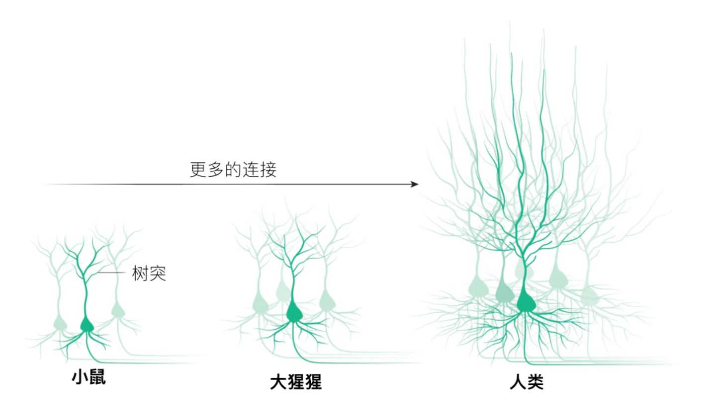 同样的神经元发育过程在人类身上耗时更长,这使得神经元能够生长出更多树突,并让每个树突的连接数量也显著增加。人类神经元的轴突能比黑猩猩的更长,因为它们需要传输更远的距离,这也让最终形成的神经元也更为复杂。