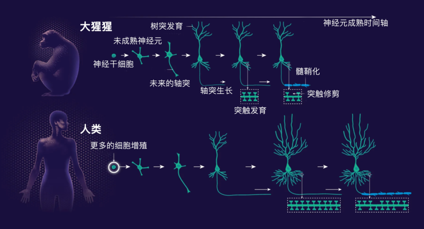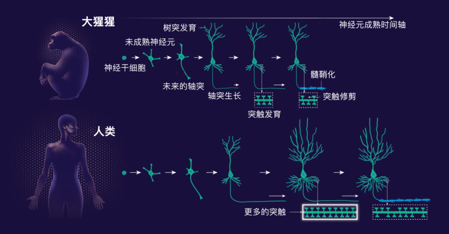 以上是黑猩猩神经元发育的典型过程:它们从神经祖细胞的分化中生成,逐渐长出轴突和树突以联系其他细胞,这些突起进一步形成突触来实现细胞间的相互连接与信号传递,最后,神经元会形成一层髓鞘,这层助绝缘结构有助于信号传导[7]。