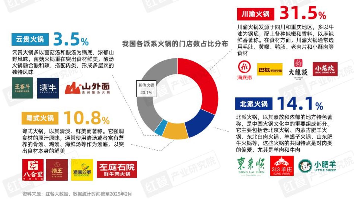 当下,火锅各派系发展情况各异,2024年至今,作为经典味型的代表,重庆火锅拥有最高的热度以及较高的门店增速;创新味型中酸汤火锅成为黑马,推动云贵火锅发展;北派火锅的增长主要靠主打性价比的牛肉火锅推动;而粤式火锅则处于门店数略有下行的态势。