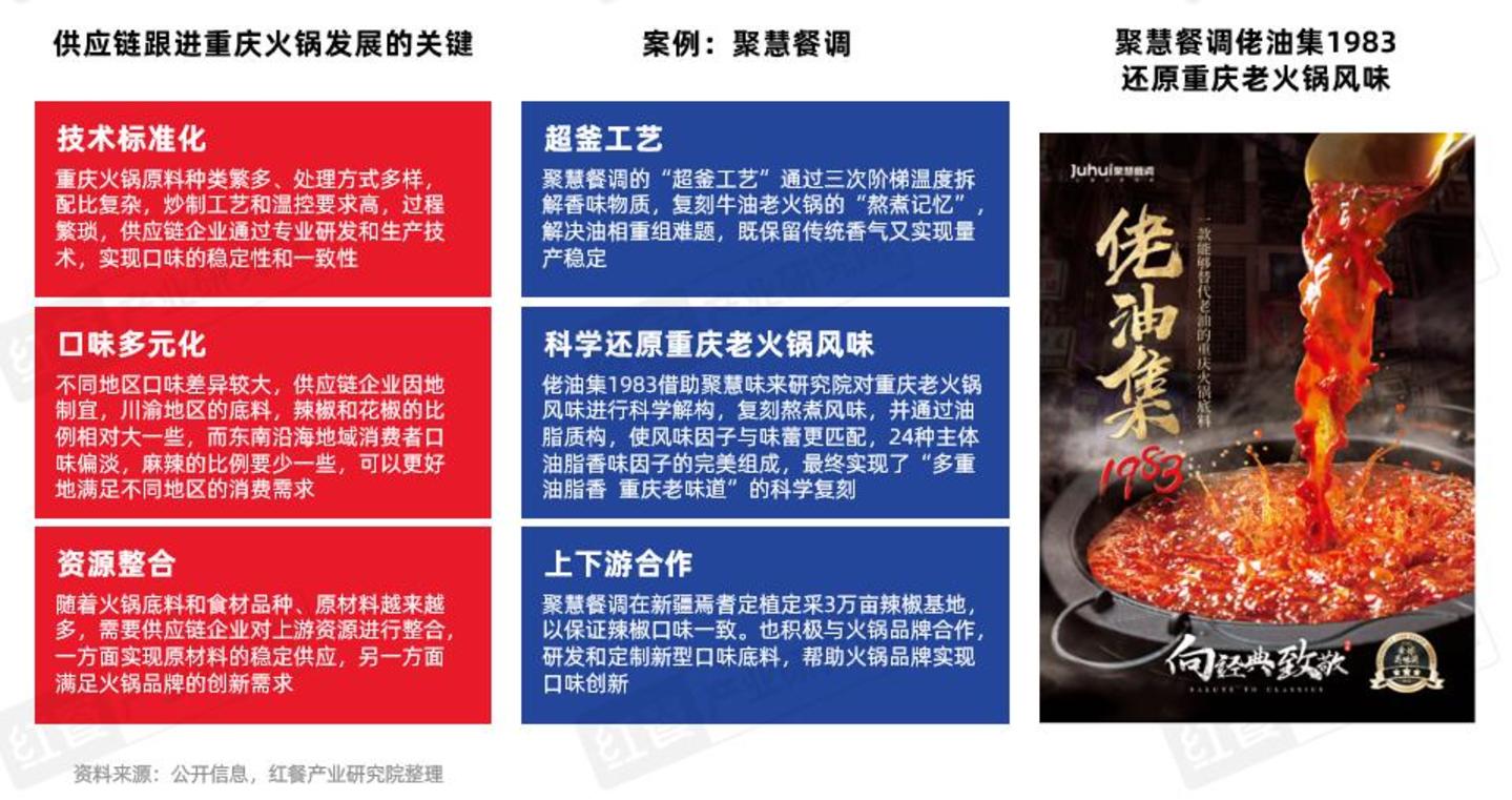 重庆火锅持续迭代发展,供应链企业积极跟进,以聚慧餐调为例,聚慧餐调致力于还原重庆老火锅风味,以超釜工艺复刻牛油老火锅的“熬煮记忆”,推出佬油集1983火重庆火锅底料,24种主体油脂香味因子的完美组成,最终实现了“多重油脂香 重庆老味道”的科学复刻。