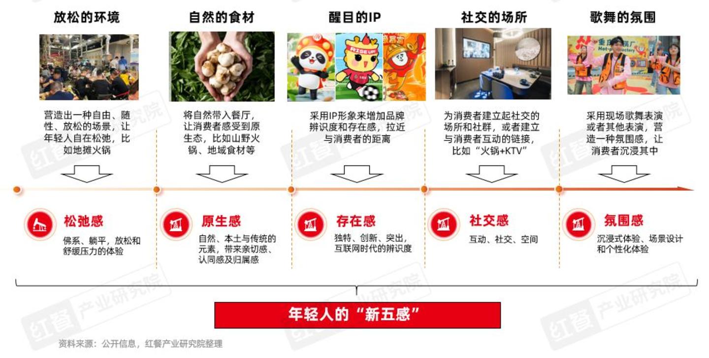 不同于传统五感,现在年轻人更注重新五感体验,这些体验都是以“精神价值”为追求目标,餐饮品牌积极在这些方面满足年轻人的新需求,比如地摊火锅让年轻人下班后可以随意自在地放松,山野火锅带给消费者亲近自然的机会,“+KTV”“+电影”让餐厅更加适合社交。