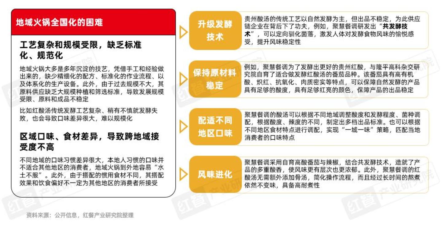随着酸汤火锅的火热,聚慧餐调等供应链企业快速跟进,一方面通过原料合作和技术实现原材料、生产流程的标准化,实现出品稳定;另一方面实现风味升级的同时,也能根据酸度、辣度的不同,制定出多档出品标准,满足不同地区消费者群体的口味差异,酸汤火锅等地域口味实现全国化。
