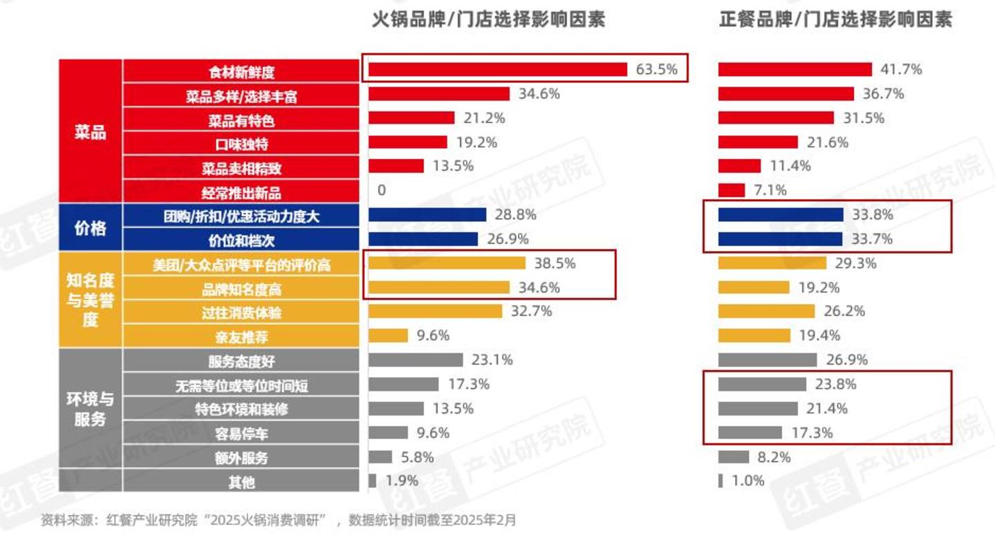 在餐饮品牌/门店选择的影响因素方面,主要有四类:菜品相关、环境服务相关、价格相关、知名度与美誉度相关。不过,火锅与正餐的影响因素差异较大,消费者在选择火锅时最看重食材新鲜度。其次是品牌知名度和美誉度,对价格的重视程度相对较低,对环境和服务方面的宽容度更高。