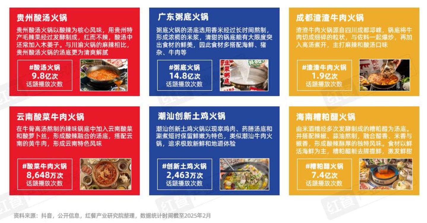 在互联网的放大作用下,地域火锅频频出圈,地域风味对其他地区的消费者群体具备新意,可满足他们的猎奇需求,因此容易出圈。比如贵州酸汤火锅、云南酸菜牛肉火锅等地域火锅在过去一年纷纷出圈。