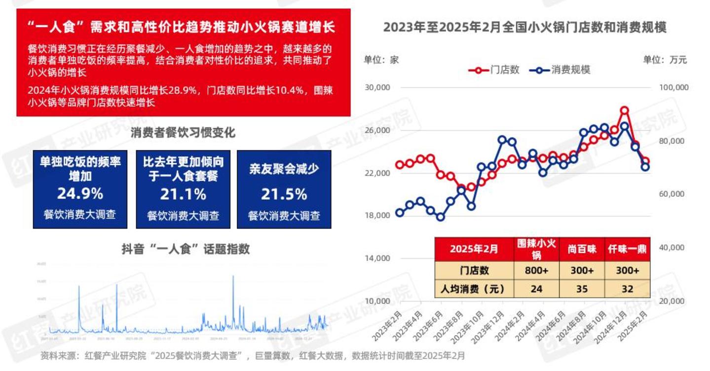 消费者餐饮消费习惯也正在发生变化,一方面是无论商务宴请还是亲友聚餐均在减少;另一方面是一人食的频率正在提升,这些变化推动小火锅赛道的火热。红餐大数据显示,2024年小火锅消费规模同比增长达28.9%,主打性价比的小火锅品牌如围辣小火锅、尚百味等门店数在过去一年快速增长。