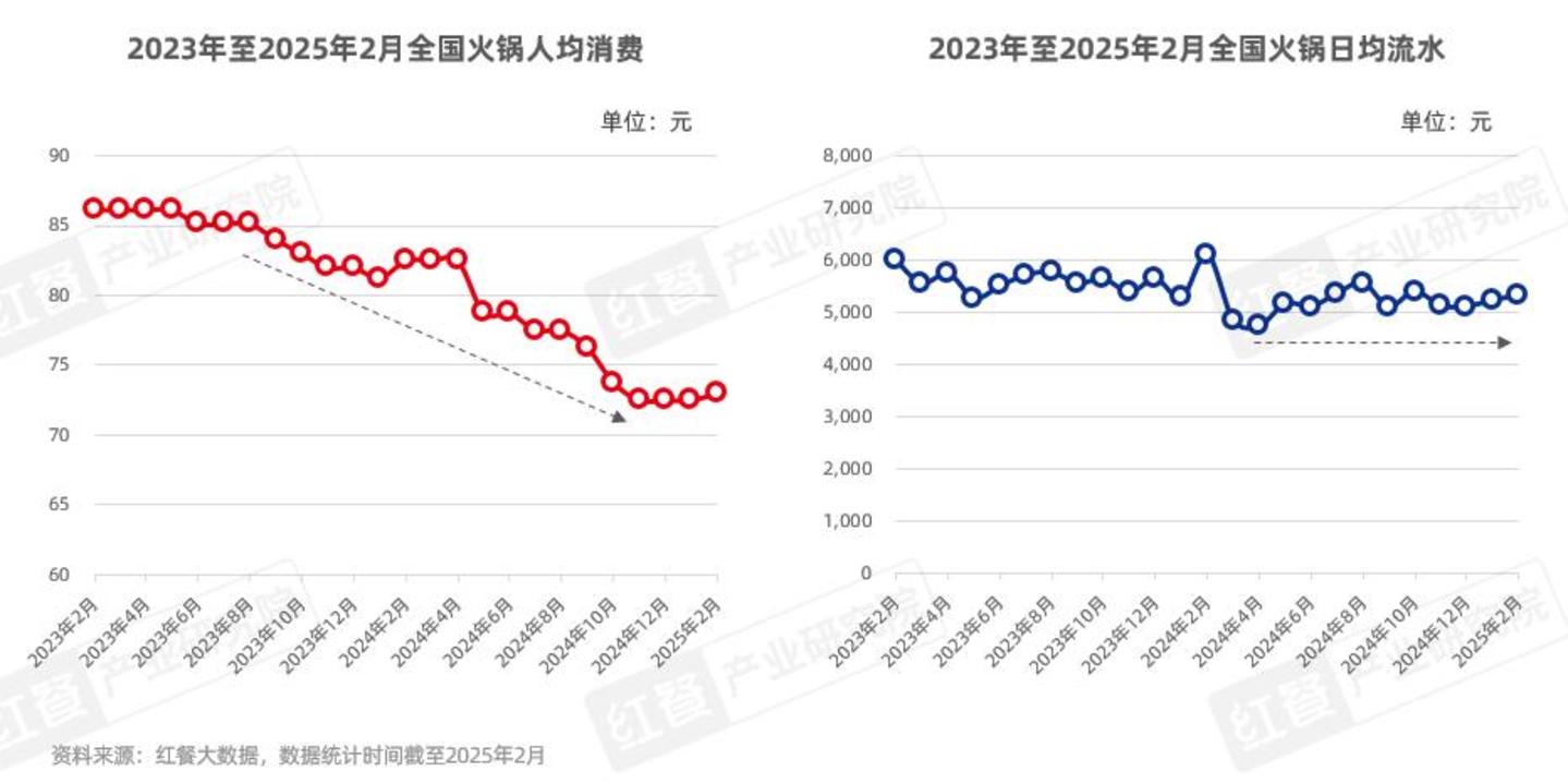 自2023年四季度以来,火锅人均消费金额有所下行,从2023年80多元的人均消费金额一直下行至2024年末的70多元。一方面是由于消费降级导致的追求性价比的趋势,另一方面是性价比火锅品牌的快速增长拉低火锅整体的人均消费金额水平。
