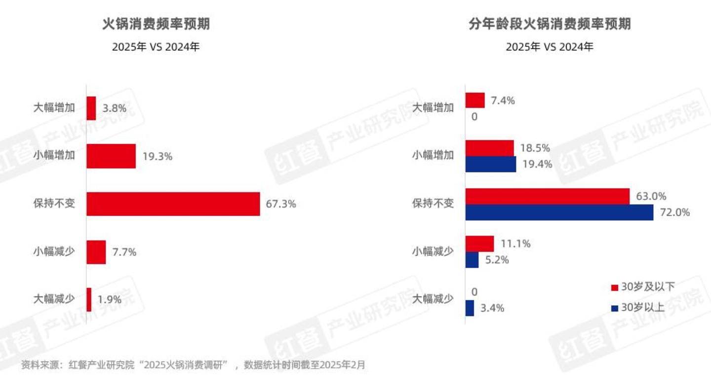 从消费预期来看,2025年的火锅消费预期好转,据红餐产业研究院“2025火锅消费调研”,预期 2025年火锅消费频率上升的消费者占比高于下降的消费者占比,表明2025年需求预计有所提升,其中年轻人群居多。