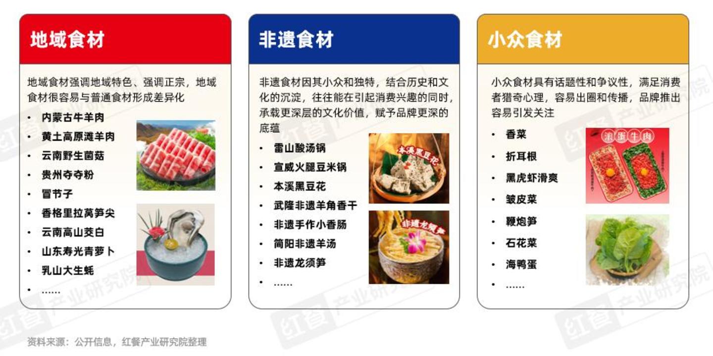 食材方面,地域食材、非遗食材、小众食材是近年火锅食材创新的主要方向,在社交媒体等因素的助力下,这三类食材非常容易出圈,一方面是这些食材往往因其小众而独特,消费者容易产生尝鲜兴趣;另一方面是容易有话题,在互联网上容易火爆起来,再加上火锅品牌的积极跟进,推动了这些食材的大众化。