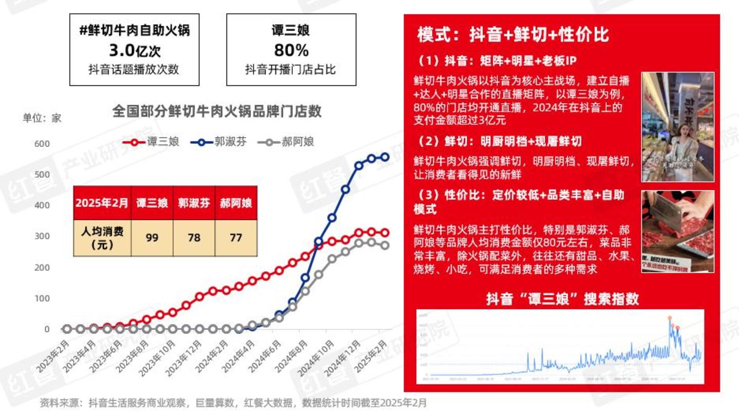 以抖音为核心传播阵地的鲜切牛肉自助火锅在2024年迎来高速增长,原因主要有三方面:(1)以抖音为主战场,打造直播+明星+老板IP的直播矩阵,实现线上成交;(2)迎合消费者求鲜的需求,明厨明档、现屠鲜切;(3)高性价比,自助模式结合低定价,再加上品类丰富,让消费者普遍感受到物有所值。