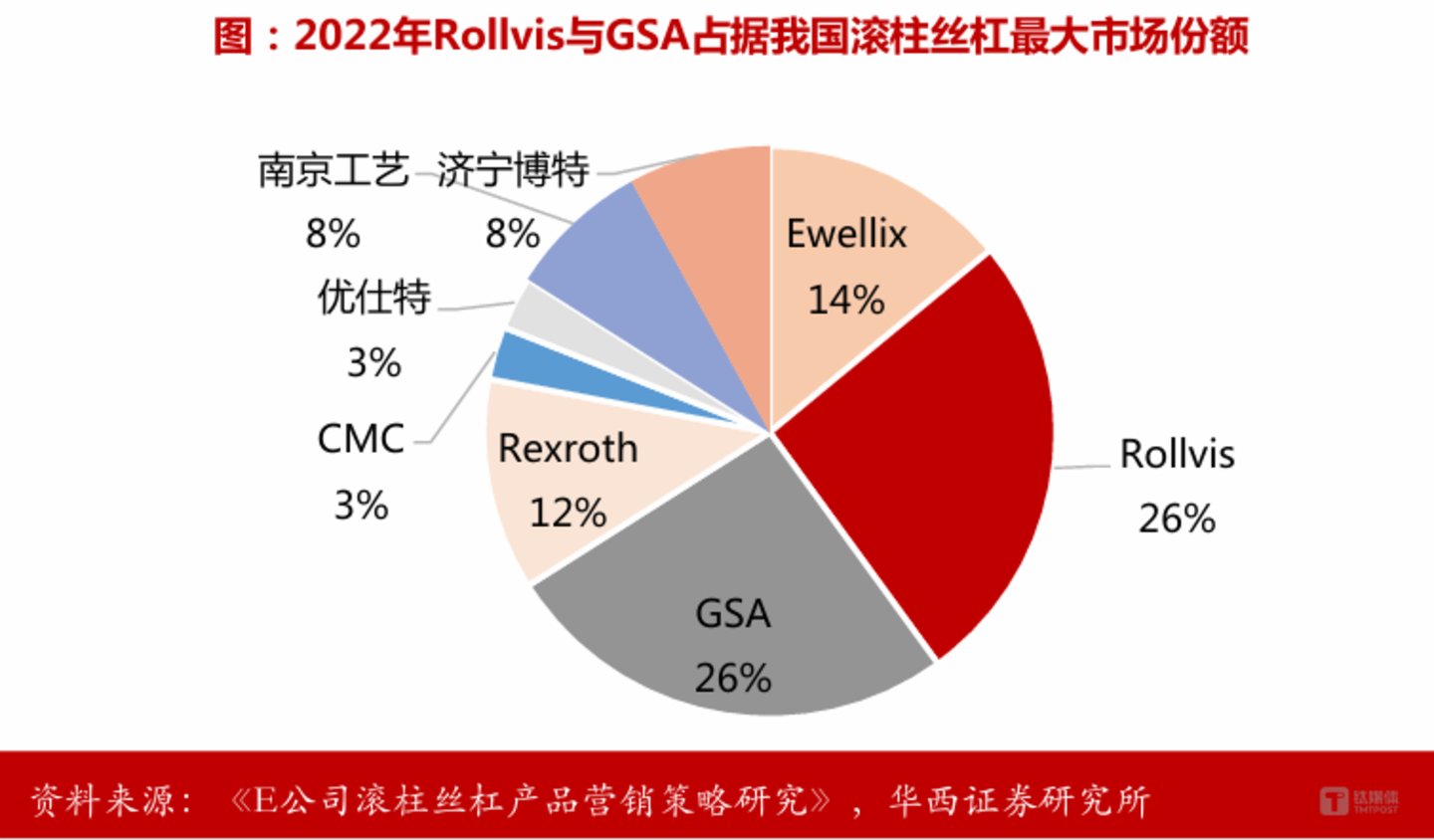 尽管人形机器人市场前景广阔,但国产丝杠的发展也面临较大挑战。以滚柱丝杠为例,华西证券的研报指出,当前,滚柱丝杠国内市场主要被国外厂商占据,国外龙头制造商Rollvis、GSA和Ewellix的市场份额占比分别为26%、26%、14%,合计占比超过50%。而国内滚柱丝杠厂商合计市场份额占比不到20%。