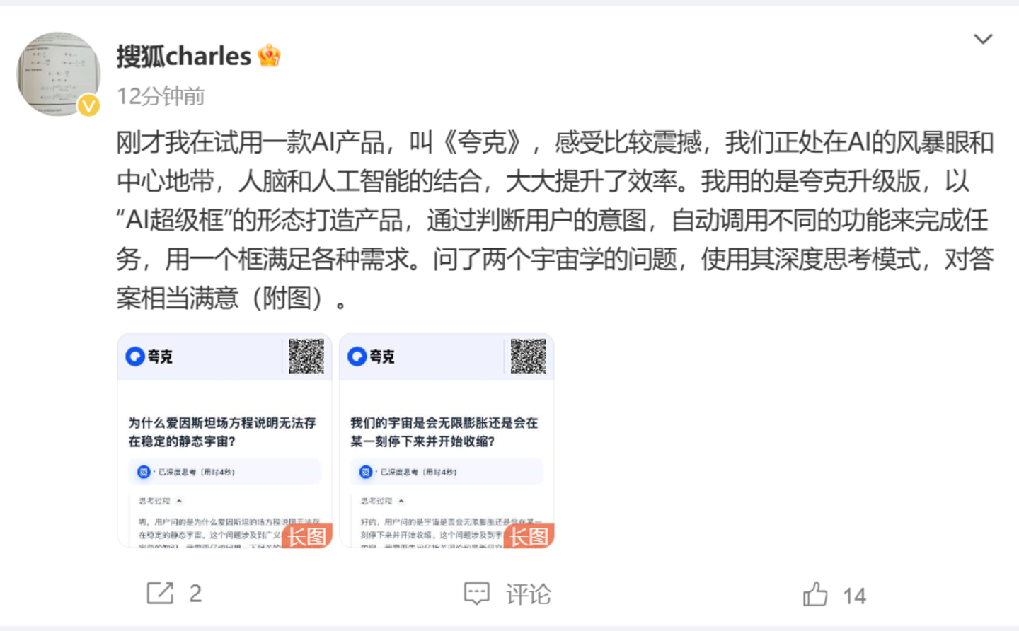 目前来看,升级后的夸克的确收获了一波正反馈。3月14日,张朝阳发布微博谈及夸克升级版,称其“以‘AI超级框’的形态打造产品,通过判断用户意图,自动调用不同的功能来完成任务,用一个框满足各种需求。问了两个宇宙学的问题,使用其深度思考模式,对答案相当满意。”