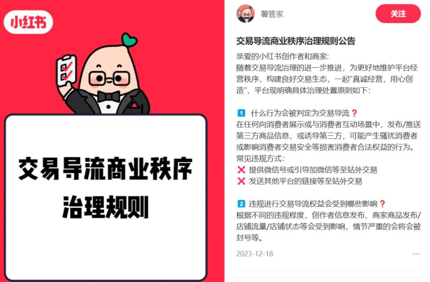 而在用户层面,小红书似乎更多的是制止博主恶意导流行为。继 2022 年 5 月上线了《社区商业公约》禁止博主为站外平台引流后,小红书一直在发布一系列治理规则、公告重点打击恶意导流行为。