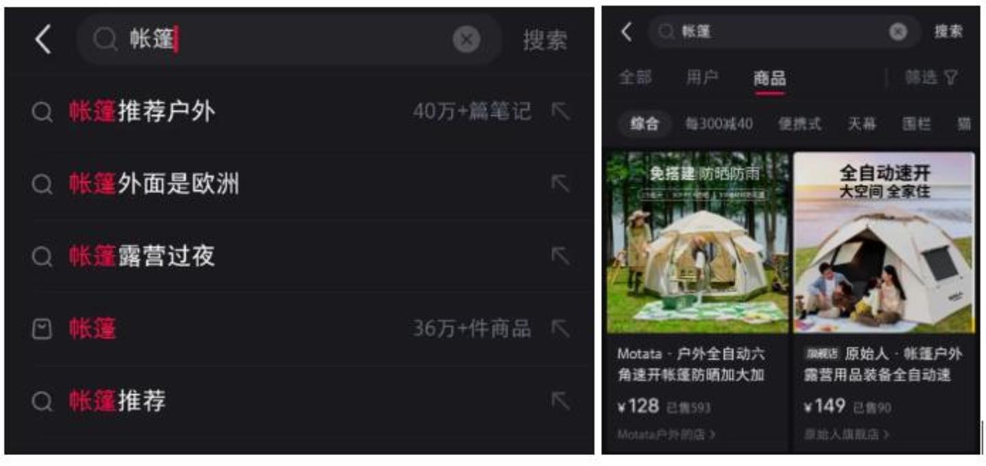 例如,首次提出的「搜索直达」。来自小红书的数据显示,每天小红书用户的搜索中,88% 为用户主动发起,这无疑是给商家一个直接、庞大的流量入口。例如搜索帐篷,除了词条之外还有商品标签的入口,点进去便显示了帐篷相关的商品,也就是直接从搜索到了付款环节。