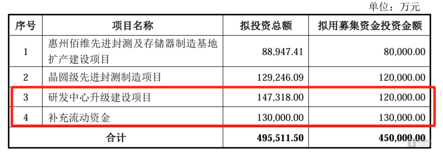 根据此前的预案,公司拟募资8亿元用于惠州佰维先进封测及存储器制造基地扩产建设项目;12亿元用于晶圆级先进封测制造项目;12亿元用于研发中心升级建设项目;13亿元用于补充流动资金,合计45亿元。但至2025年注册稿,补流资金被完全剔除,研发中心投入同步消失,剩余19亿元集中投向惠州扩产与晶圆级先进封测项目。