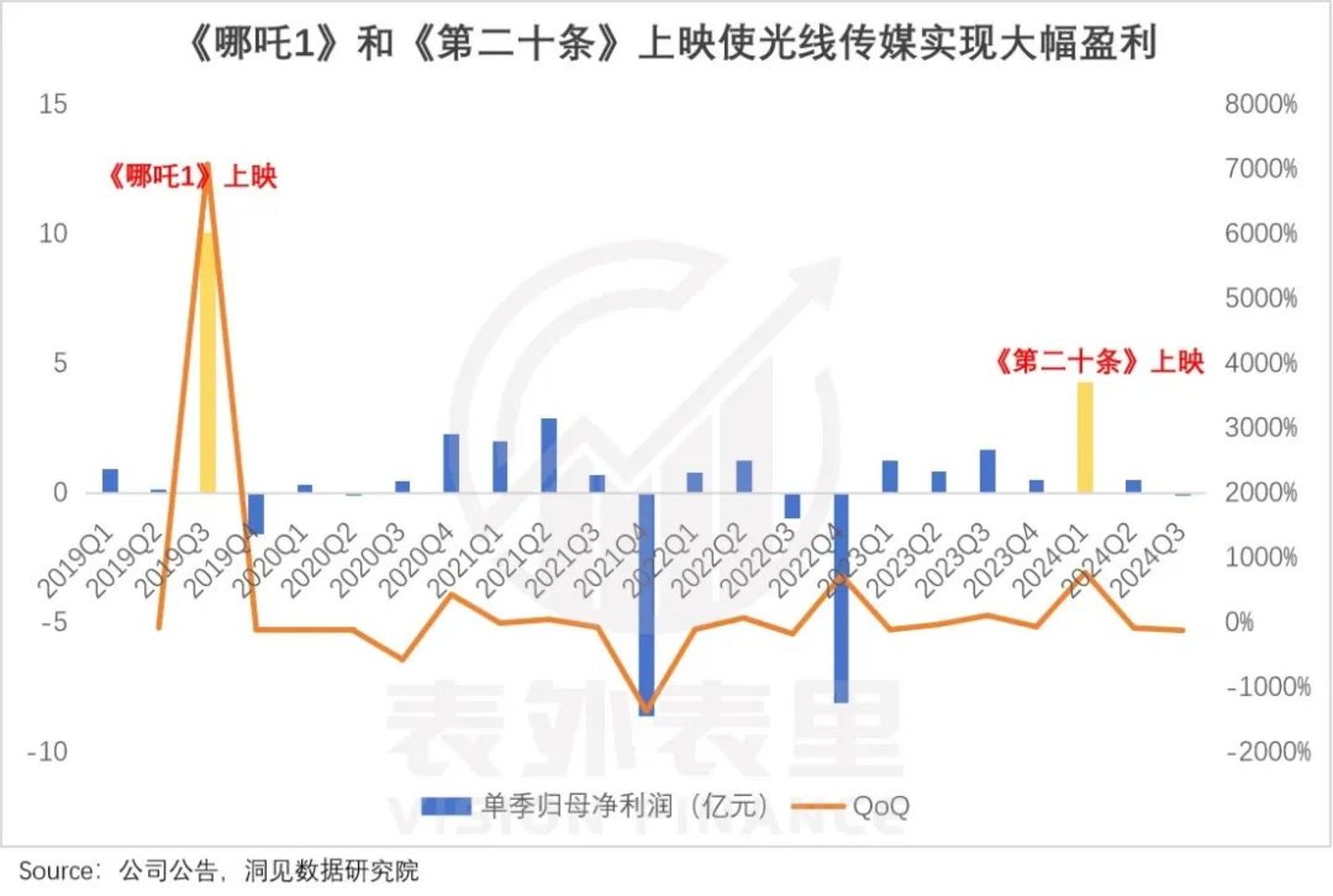 可以看到,《哪吒2》不计成本投入的背后,是出资方在兜底——2019-2024年光线传媒业绩大开大合,只有《哪吒1》《第二十条》上映期间大幅盈利。