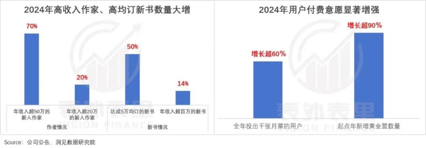 创作生态升级下,2024年阅文新增作家33万;年收入超百万的新书同比增长14%,《天才俱乐部》等新晋作品持续打破平台纪录。