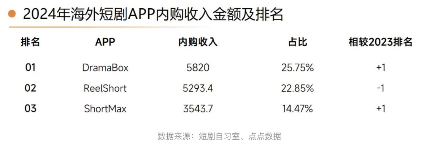 点点数据显示,2024年海外短剧APP内购收入方面DramaBox已与ReelShort不相上下,均超过了5000万美元。排第三的ShortMax比前两者的规模更小,内购收入约3500万美元。