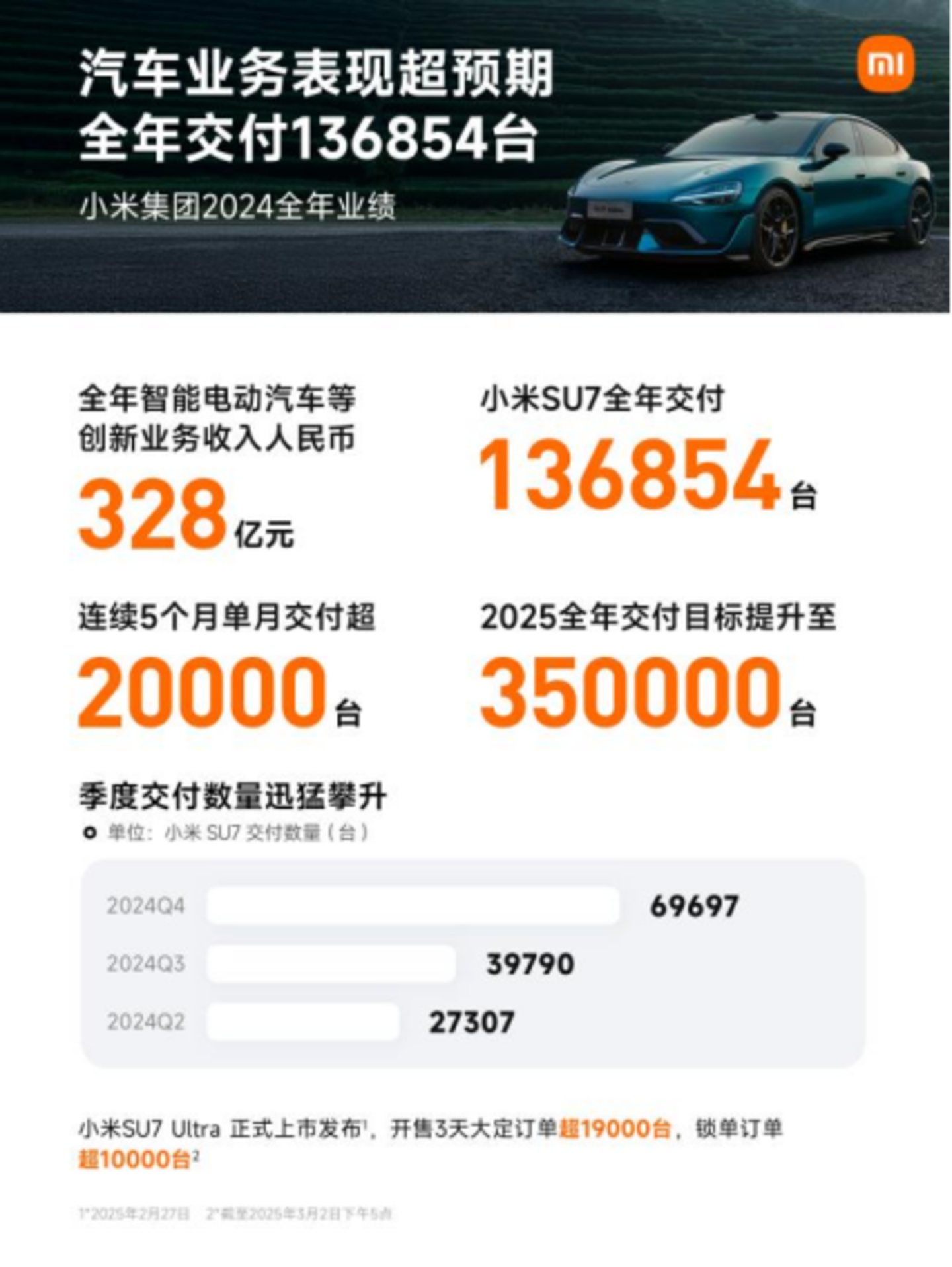 3月18日,雷军披露“刚刚交付了第20万辆小米汽车”。公司正全力提升产能并已取得进展,2025年全年交付目标已上调至35万台。