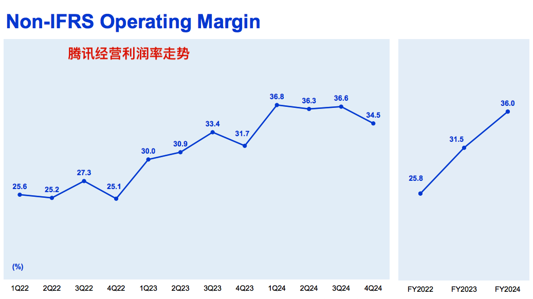 我们看腾讯近三年的经营利润率,从2023年开始保持在30%以上,而整个2021和2022年各季度都是低于这个水平的。为应对低迷环境所做的降本增效和缩减非核心业务举措,对改善利润率产生了明显效果,受益于广告、金融及企业服务的毛利率增加。但另一方面,资本开支大幅增加后的逐季折旧影响具有一定的滞后性,现在还无法从利润表里充分体现。仅看Q4,经营利润率34.5%环比Q3的36.6%已略有下降,后续更待观察。