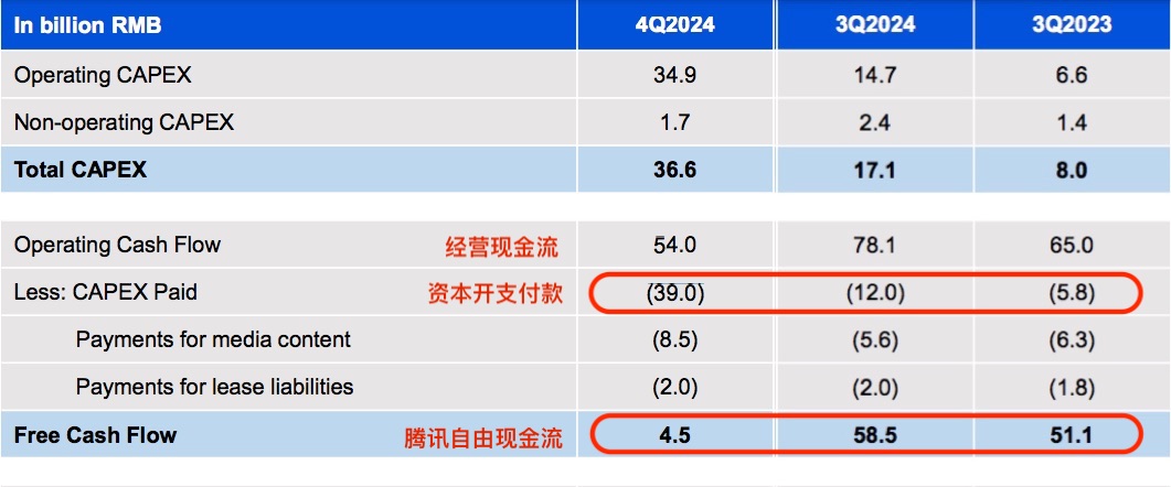 腾讯昨天发布2024年四季度财报,总收入同比增速在时隔一年多后重回双位数百分比,达到11%,经营利润增长24%。更值得关注的是,四季度它的资本开支高达366亿元,同比环比都明显抬升,主要用于购买英伟达芯片了,而且这个资本开支水平可能将是未来季度的常态。