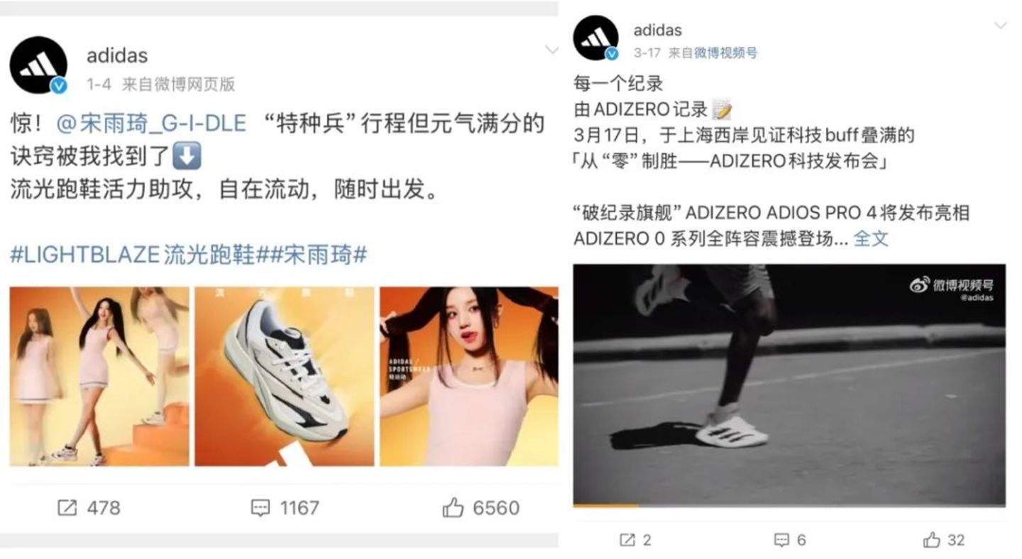 从社交平台的消费者互动反馈数据可见一斑,根据阿迪达斯官方微博互动表现,其聚焦跑步运动的新产品发布微博转发和评论仅为个位数,点赞量在30左右浮动,而与宋雨琦发布的产品互动微博,转发量477,评论量1167,点赞量更是超过6500,两者差距悬殊。