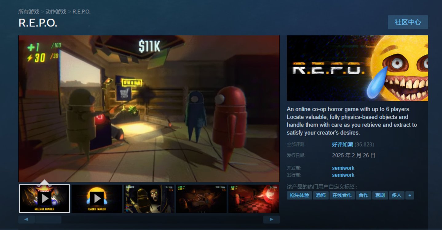 最近十分火热的《R.E.P.O.》也是基于《致命公司》的玩法框架下,进行了微创新。
