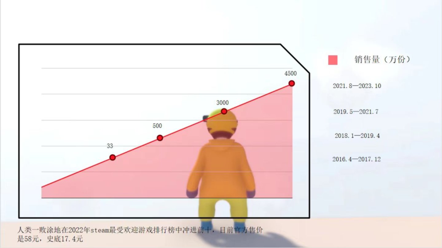 在最初的两年,《人类一败涂地》销量只有33万份。但经过2019年和2020年,在各大主播的游玩宣传下,到2020年8月份销量达到3000万份。