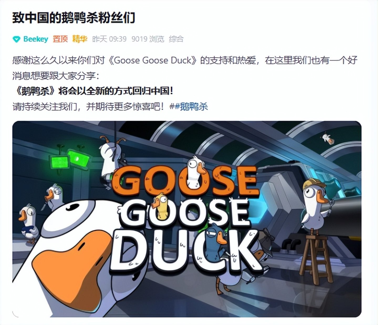 3月18日,曾经红极一时的《鹅鸭杀》的创作者Shawn宣布,已经决定和一家中国公司合作,将会把《鹅鸭杀》带回中国。「鹅鸭杀官宣回归」这个话题也是登上微博、B站、抖音等平台的热搜。