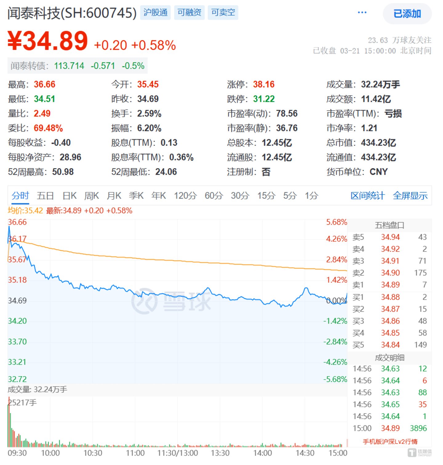 二级市场方面,闻泰科技股价高开5个点,收涨0.58%。
