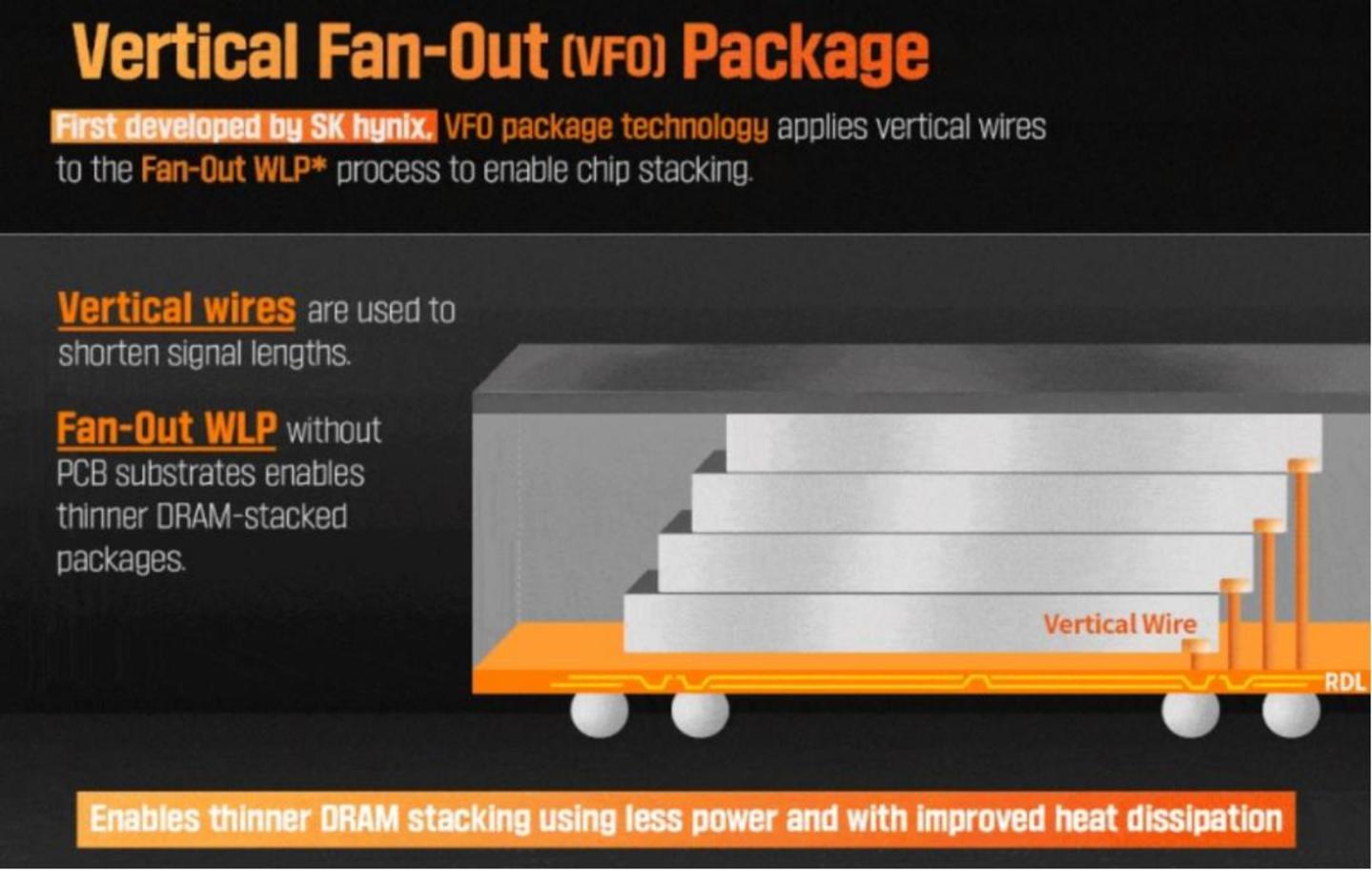SK海力士的VFO技术结合了FOWLP(晶圆级封装)和DRAM堆叠两项技术,VFO技术通过垂直连接,大幅缩短了电信号在多层DRAM间的传输路径,将线路长度缩短至传统内存的1/4以下,将能效提高4.9%。这种方式虽然增加了1.4%的散热量,但是封装厚度却减少了27%。