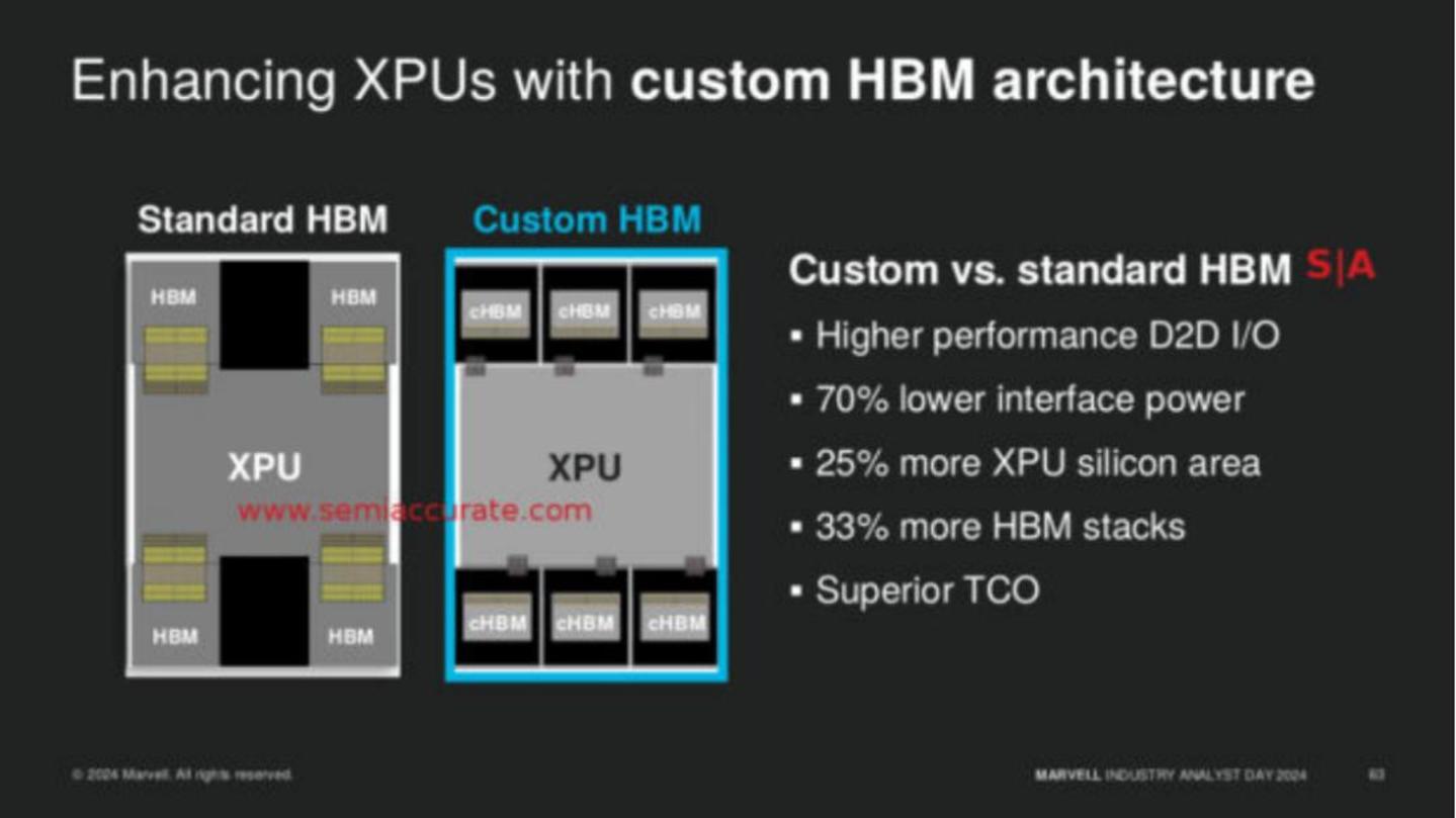 在接口方面,可见下图,HBM 是集成在 XPU 中的关键组件,使用先进的 2.5D 封装技术和高速行业标准接口。然而,XPU 的扩展受到当前基于标准接口架构的限制。全新的 Marvell cHBM 计算架构引入定制接口,以优化特定 XPU 设计的性能、功耗、芯片尺寸和成本。