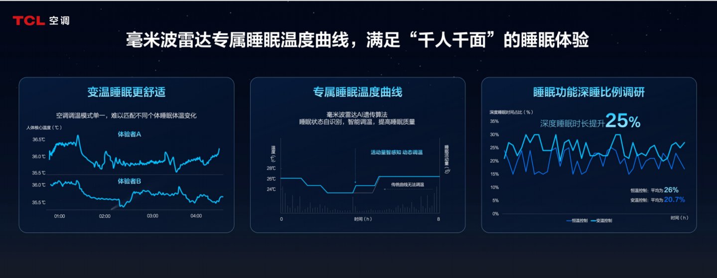 在九大国际领先技术的赋能加持下,TCL空调精准锚定影响用户睡眠质量的关键客观环境因素,打造AI睡眠、AI语音、AI省电三大智慧健康科技,并持续创新推出小蓝翼系列空调“新物种”,向用户提供极致的智慧健康睡眠体验。