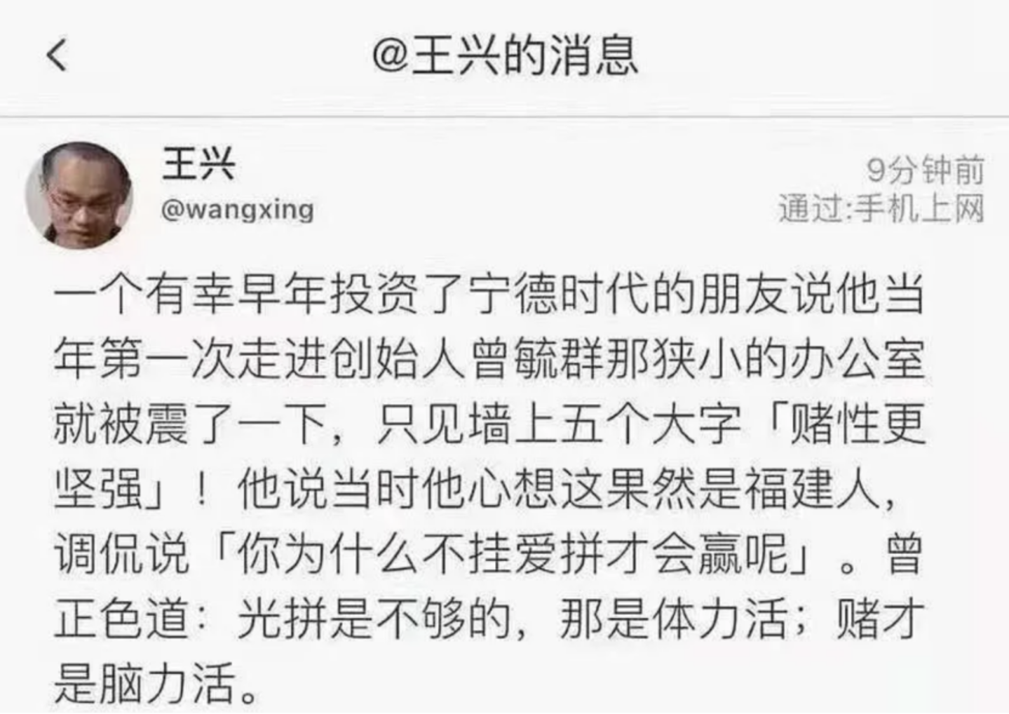 这种博弈心态,在宁德时代和曾毓群身上,同样有着明显展露。同为福建人的美团创始人王兴,曾经在自己的饭否上回忆道:一个有幸早年投资了宁德时代的朋友说,他当年第一次走进创始人曾毓群那狭小的办公室就被震了一下,只见墙上五个大字“赌性更坚强”!他说当时他心想这果然是福建人,调侃说“你为什么不挂爱拼才会赢呢?”曾正色道:“光拼是不够的,那是体力活;赌才是脑力活。”