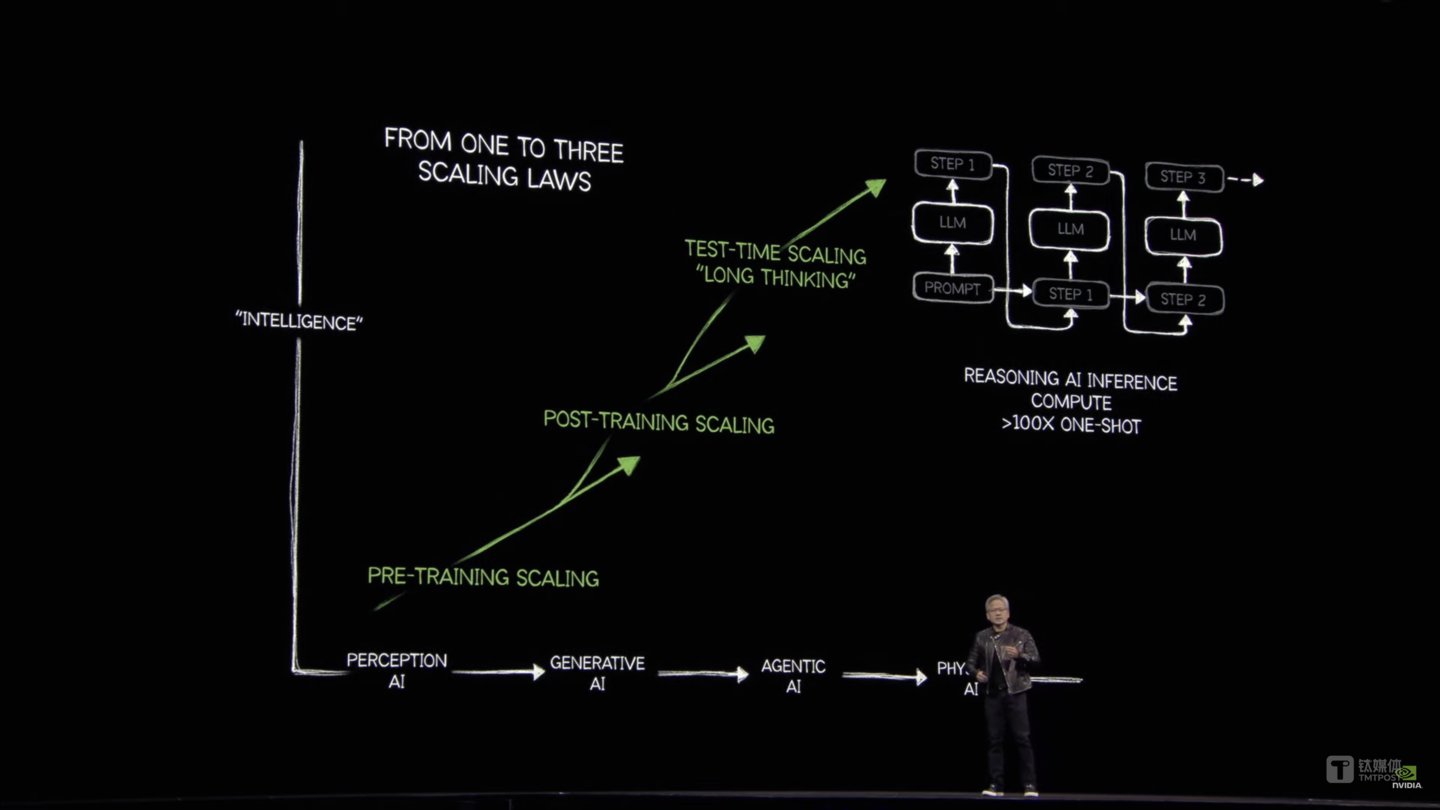 黄仁勋认为,从两年前的ChatGPT到如今DeepSeek引发的推理能力,Scaling Law(规模定律)并没有消失,而是从一个变成了三个——预训练扩展、在代理人工智能(Agentic AI)阶段的后训练扩展,如今的算力需求已比去年预估的规模高出100倍。