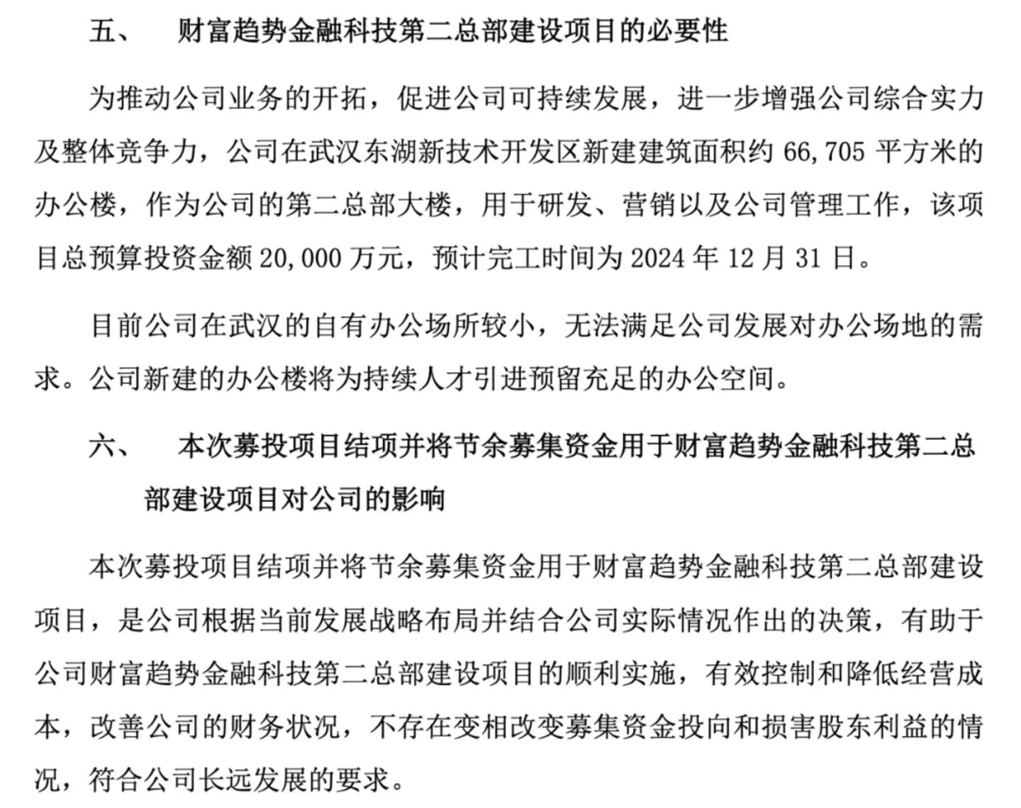 两个募投项目“节余(包括理财收益)”的合计近两亿IPO融资,被财富趋势悉数划转给“加挂”在募投项目名下的第二总部工程建设。