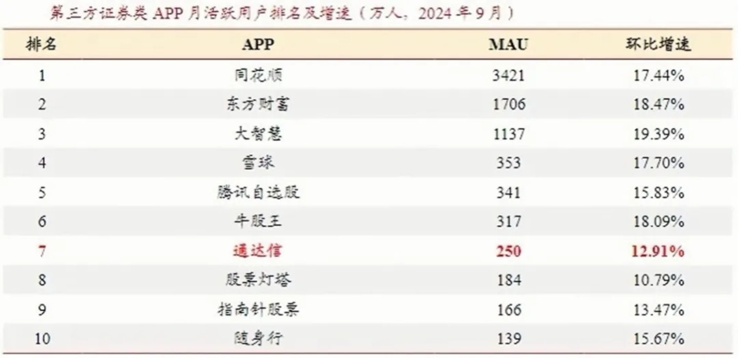 C端业务并没有因此表现出丝毫“后发优势”,反而因为发力太晚失了先机:上市5年,虽然喊着“近年来公司在C端市场加大发力,持续打磨产品,拓展流量转化….”的号子,截至2024年9月,通达信APP的月活跃用户数仅为250万,在第三方证券类APP中排名第 7,远低于月活数千万级的同花顺、东财等。