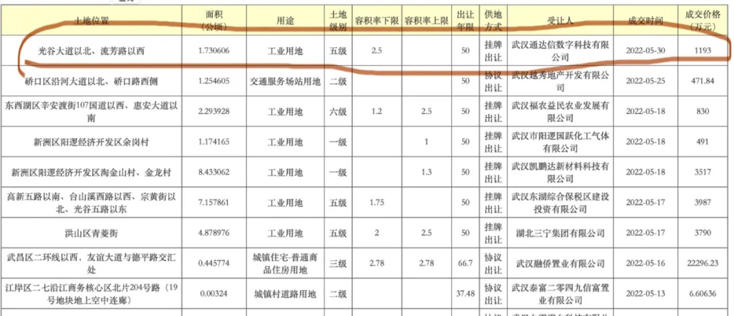 2022年5月30日,武汉通达信数字科技有限公司以底价1193万摘得约26亩的工业用地,土地级别是较便宜的5级,平均每亩不到46万。
