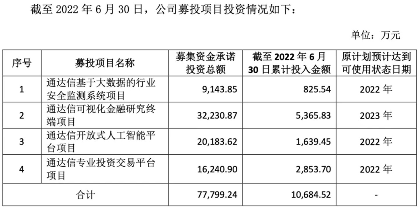 另一个募投项目——“通达信专业投资交易平台项目”拟投入募集资金超1.62亿人民币,实际使用不到四成资金(6386万)就“建设完成且达到预定可使用状态”。