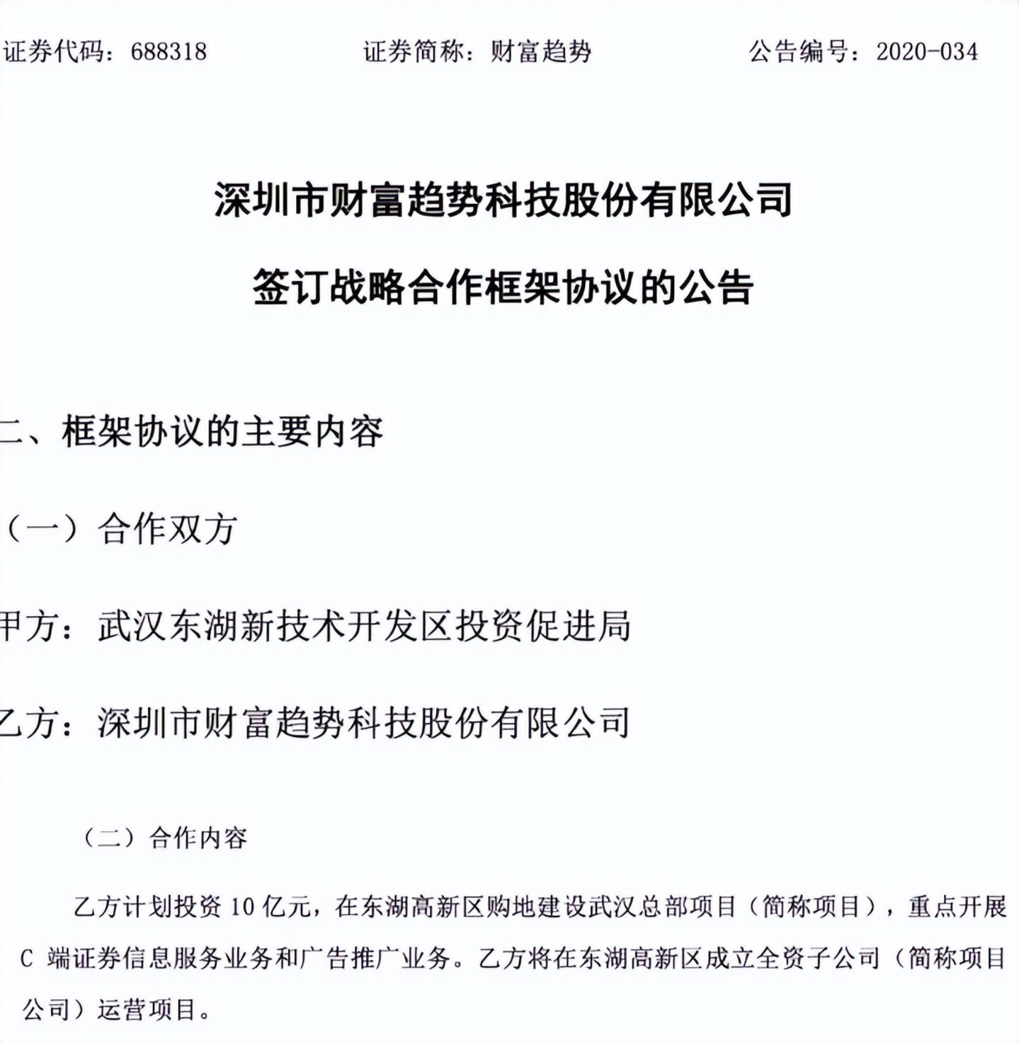比如,2020年11月公告于武汉东湖开发区签署战略合作框架协议时表述为:“计划投资10亿元,在东湖高新区购地建设武汉总部项目,重点开展C端证券信息服务业务和广告推广业务。”