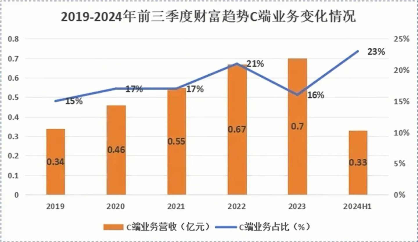 财富趋势发展至今,长年累月主做的是机构生意,营收8—9成来自B端业务,面向个人投资者的C端业务营收占比绝大多数时期在20%以下徘徊。