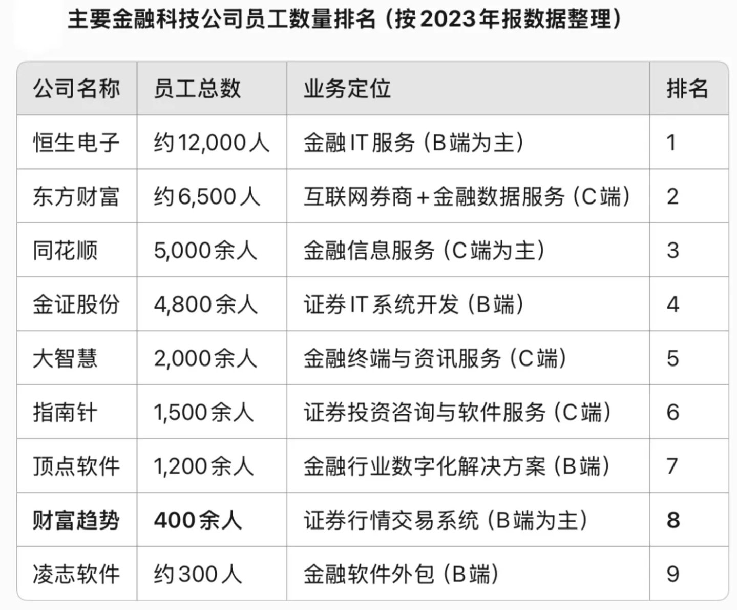 财富趋势2024年半年报显示其研发人员总数为328人,占公司总人数69.05%,据此可知员工总数475人。人员规模与前述7家大、中型金融科技类公司相去甚远,仅比做金融软件外包服务的凌志软件略多,位列倒数第二。