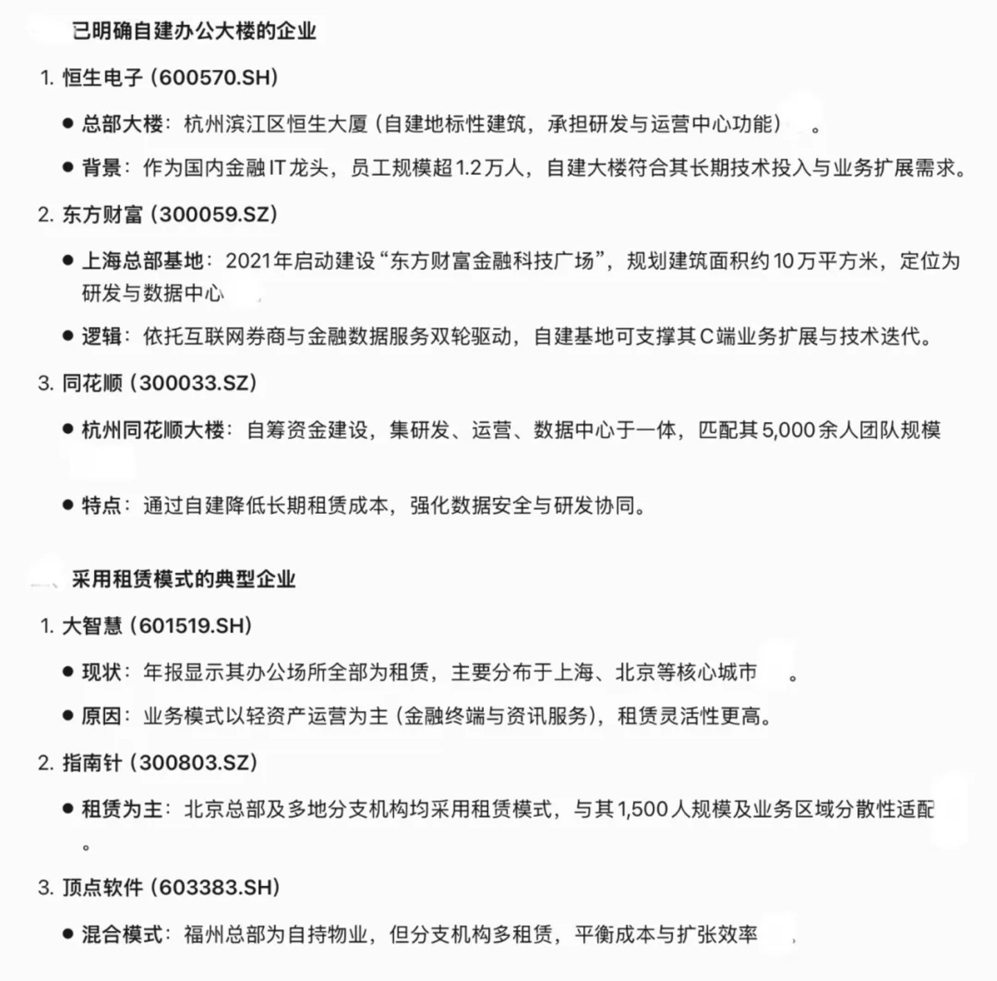 中等规模的四家企业员工数量从1200人至5000人,却无一自建办公大楼,甚至购买办公场地的占比都不算多。比如员工数量约两千人的大智慧,其办公场地主要采取短租模式。