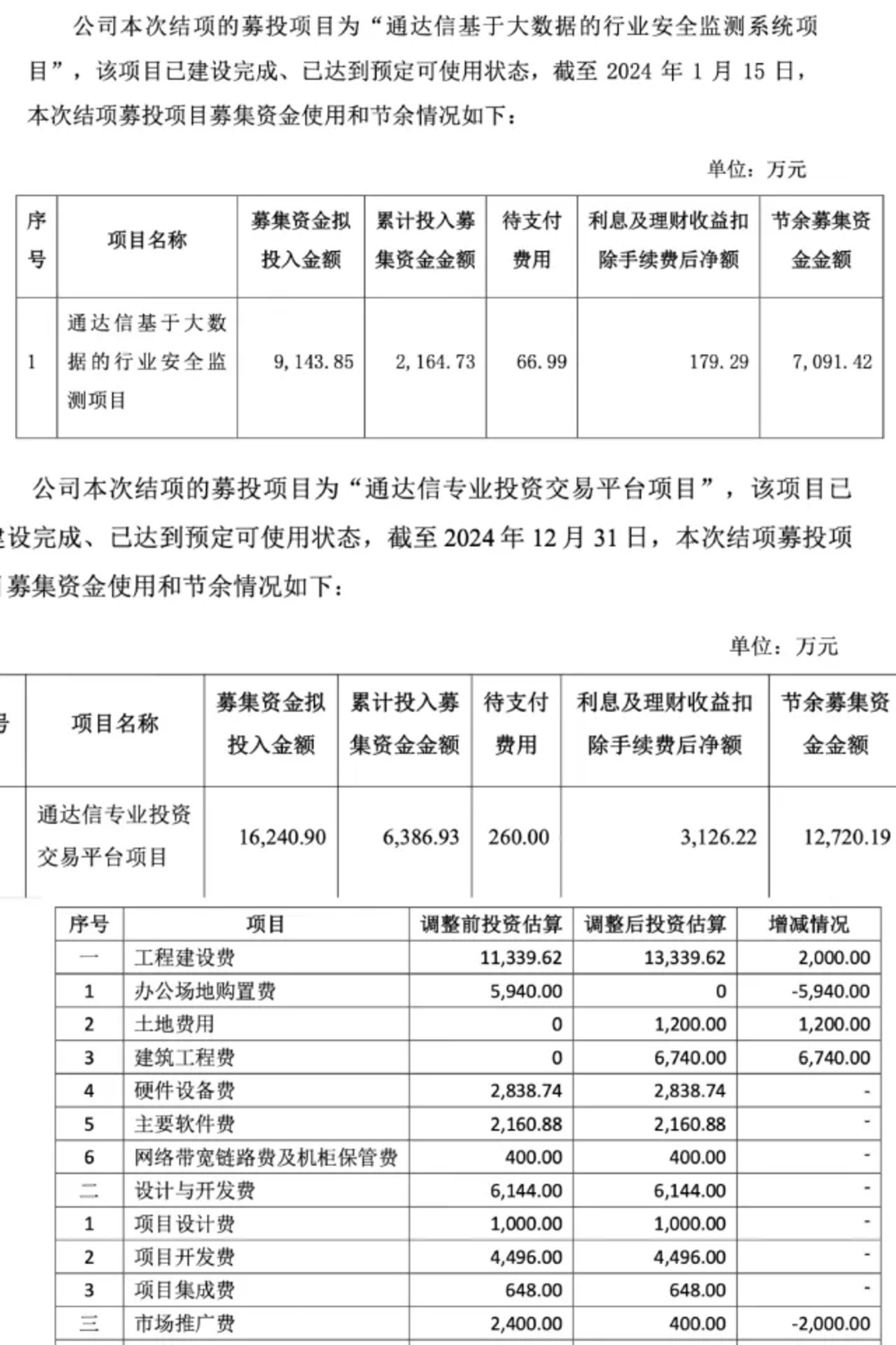 比如,“通达信基于大数据的行业安全监测系统项目”于2023年末结项,原本募集资金拟投入金额9143.85万元,实际仅使用不到四分之一(2164.73万元),未使用的资金占比竟超过四分之三。