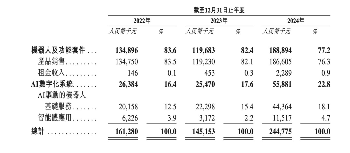 报告期内,云迹科技来自机器人及功能套件的收入分别约为1.35亿、1.20亿、1.89亿元,占总收入的比例分别为83.6%、82.4%、77.2%;来自AI数字系统的收入分别约为2638.4万、2547.0万、5588.1万元,占营收的比例分别为16.4%、17.6%、22.8%。