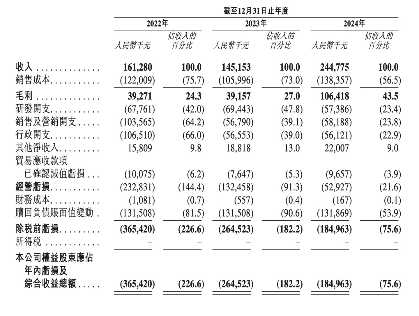 报告期内,云迹科技的收入分别约为1.61亿、1.45亿、2.45亿元,复合年增长率约23.2%;毛利分别约为3927.1万、3915.7万、1.06亿元,复合年增长率约为64.6%;毛利率分别为24.3%、27.0%、43.5%,呈逐年上升趋势。